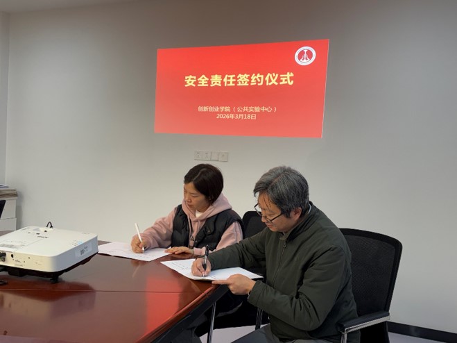 为进一步压实实验室安全责任,筑牢实验教学安全防线,切实保障师生人身安全和实验教学工作有序开展,3月18日,创新创业学院(公共实验中心)举行了2026年安全防范工作责任签约仪式。学院(中心)领导班子成员、下属各中心主任及办公室人员参加了本次仪式。